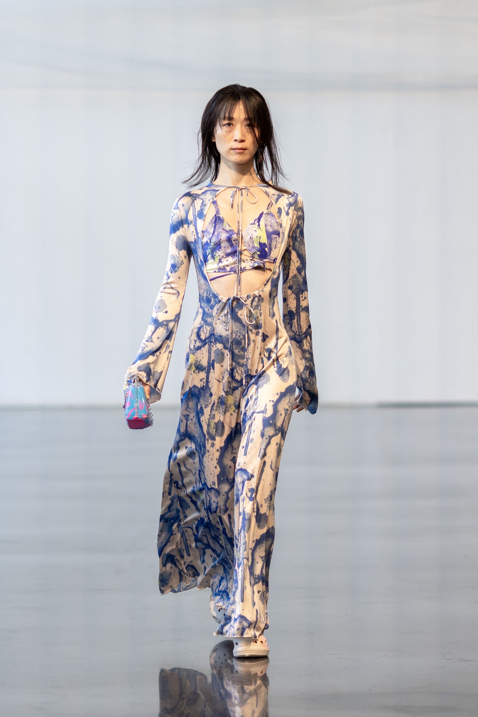 这个连实习生都没的设计师品牌由好友 Yiheng Chu 与 Lingyu Hao 于 2019 年在上海创立,这回的 2021 秋冬系列才首次做秀。本季受意大利惊悚老电影《Suspiria (阴⻛阵阵)》启发,设计师从影片中光怪陆离的视觉语言里汲取养分,形成色彩斑斓的印花。并微妙地将模特演绎电影里受女巫玩弄的主⻆们,陷入群体无意识状态而经历荒诞的种种事件。