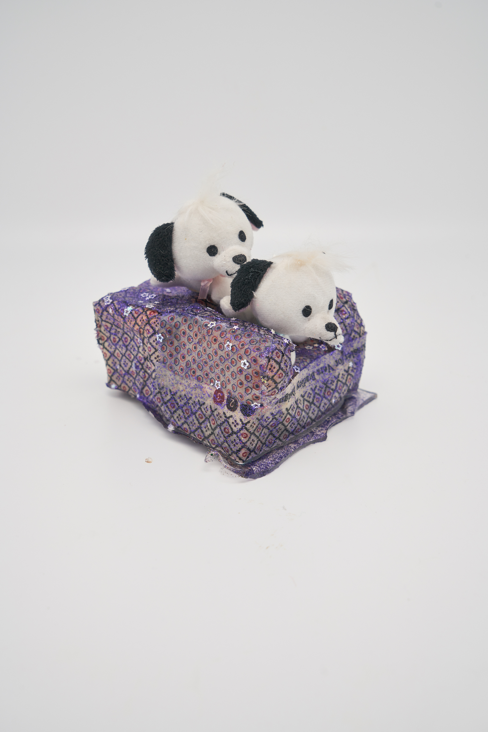 不管是绘画还是雕塑作品,金宁宁的造型感一贯自由而随意,用可爱的姿态来破坏已有的规则。这些沙发由各种奇怪的材料手工组合而成,有着模糊不清的不明朗形态但覆盖着闪烁且诱人的亮片。在昏暗的展览现场,沙发被放置在地上,你需要蹲下来很用力地对焦还不一定能看清它们。为此,我们特意问金宁宁和C5CNM画廊要来这组小沙发的高清作品图,可以让大家细致地观看。
