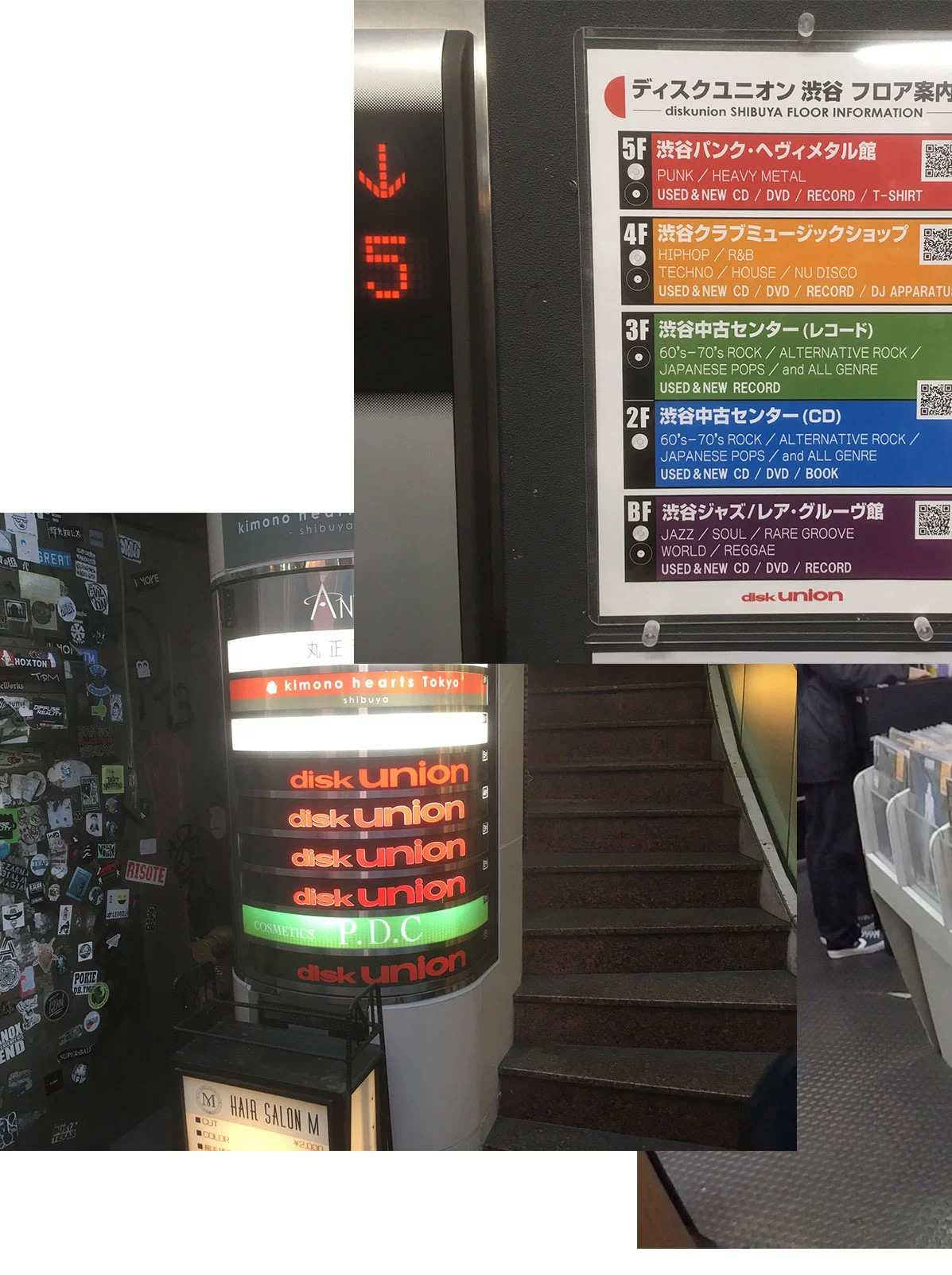 东京大型连锁唱片店 Disk Union 涉谷分店离涉谷地铁站很近。在熙熙攘攘的购物人潮中看到它的标志,总有历尽万水千山终于到家的感觉。logo 上粗体的“union”,恐怕不仅代表乐迷的团聚,还有庞大的音乐汇总。Disk Union 以二手唱片为主,每间店每层楼都有自己的专属风格,而唱片的分类摆设更加专业。这对乐迷来说是最省事儿的,你可以按照音乐单位首字母从A到Z来翻找黑胶,也可以直接挑选 Techno、House、Disco、J-club、Jungle、Breakbeat 等细分风格或者具体的某些著名音乐人。总的说来日本人和我们的口味差异不大,举个例子,每家店都能看到 Moodymann 和 Theo Parrish 的专区(你知道这两个老黑为什么常去日本演出了吧),光是他们极其相关厂牌的黑胶就层出不穷。