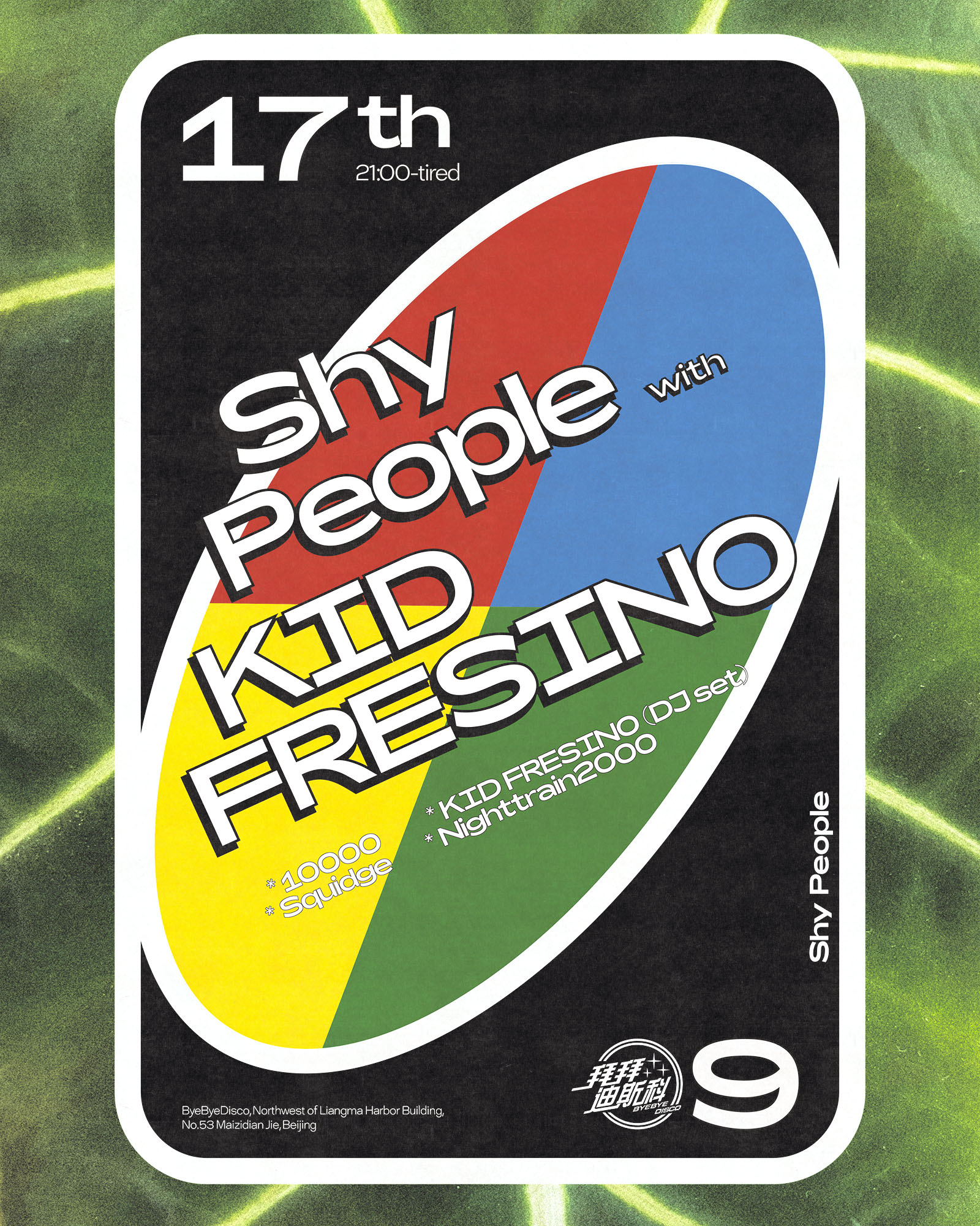 在北京新俱乐部 ByeByeDisco 本周日的夜晚,KID FRESINO 将呈现他有趣的另一面 —— DJ 身份。你可以从中听到他未曾透露的私人口味,请来接受他的 UK Bass 惊喜大礼包。而作为同样不擅社交但可以藏在 DJ 台后面表达自我的同类,Shy People 主理人 10000、北京左派 DJ 新军 Squidge 和 Nighttrain2000 也将在这个夜晚带来属于他们精选的韵律与节拍。